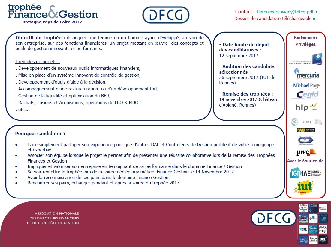 L'IGR-IAE Rennes est partenaire de la DFCG (Association nationale des Directeurs Financiers et Directeurs du Contrôle de Gestion) pour l'organisation du 7ème Trophée Finance&Gestion DFCG Bretagne Pays de Loire (BPL).