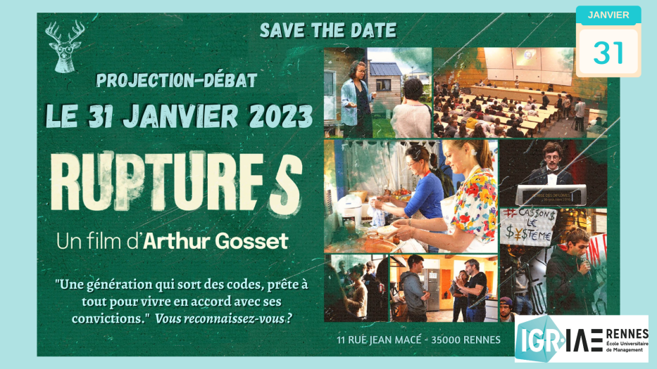 A noter dans vos agendas : l'IGR-IAE Rennes vous propose d'assister à une projection du film "Ruptures", le mardi 31 janvier.