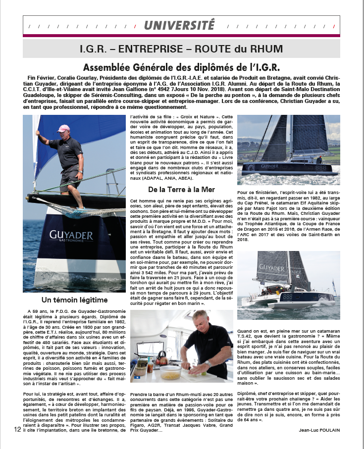 En février dernier, Christian Guyader, dirigeant du groupe Guyader Gastronomie était l'invité d'IGR Alumni lors de l'Assemblée Générale pour présenter son parcours d'entrepreneur breton et pour échanger avec les diplômés et étudiants présents à l'événement.